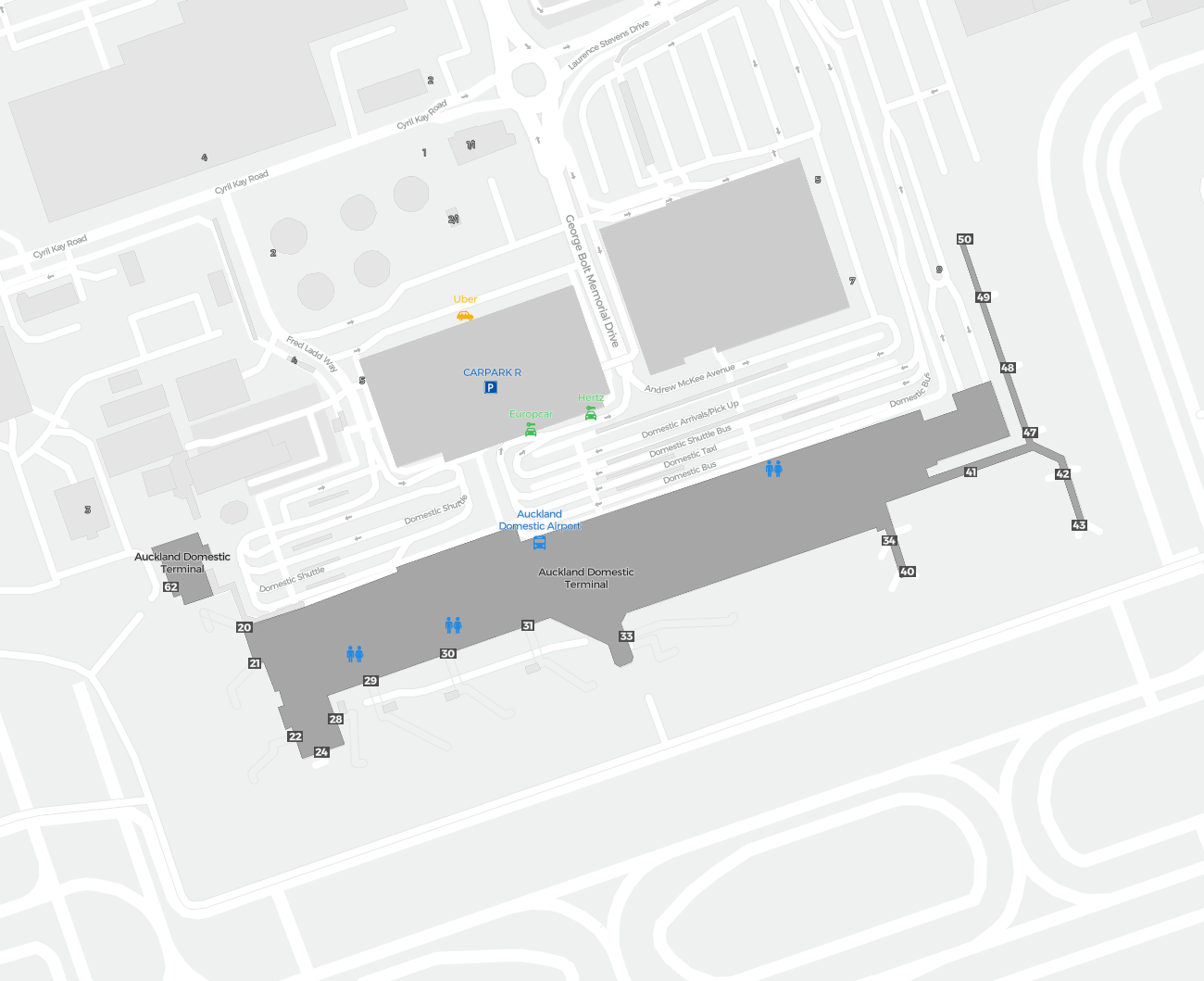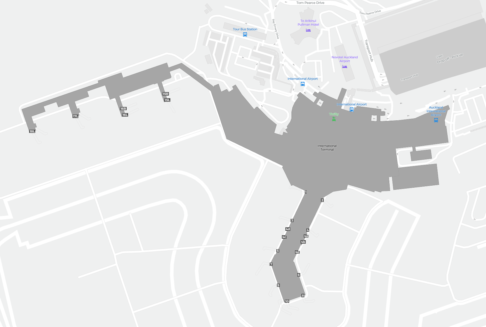 This is a zoomable map over Auckland (AKL). The map can give you an overview of the outdoor area with terminals, parkings, and at some airports also details of gates, car rental facilities, and other amenities if you zoom in.