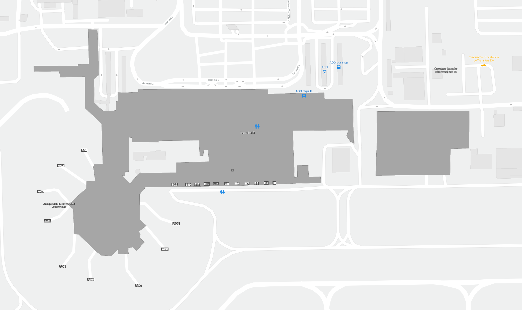 This is a zoomable map over Cancún (CUN). The map can give you an overview of the outdoor area with terminals, parkings, and at some airports also details of gates, car rental facilities, and other amenities if you zoom in.