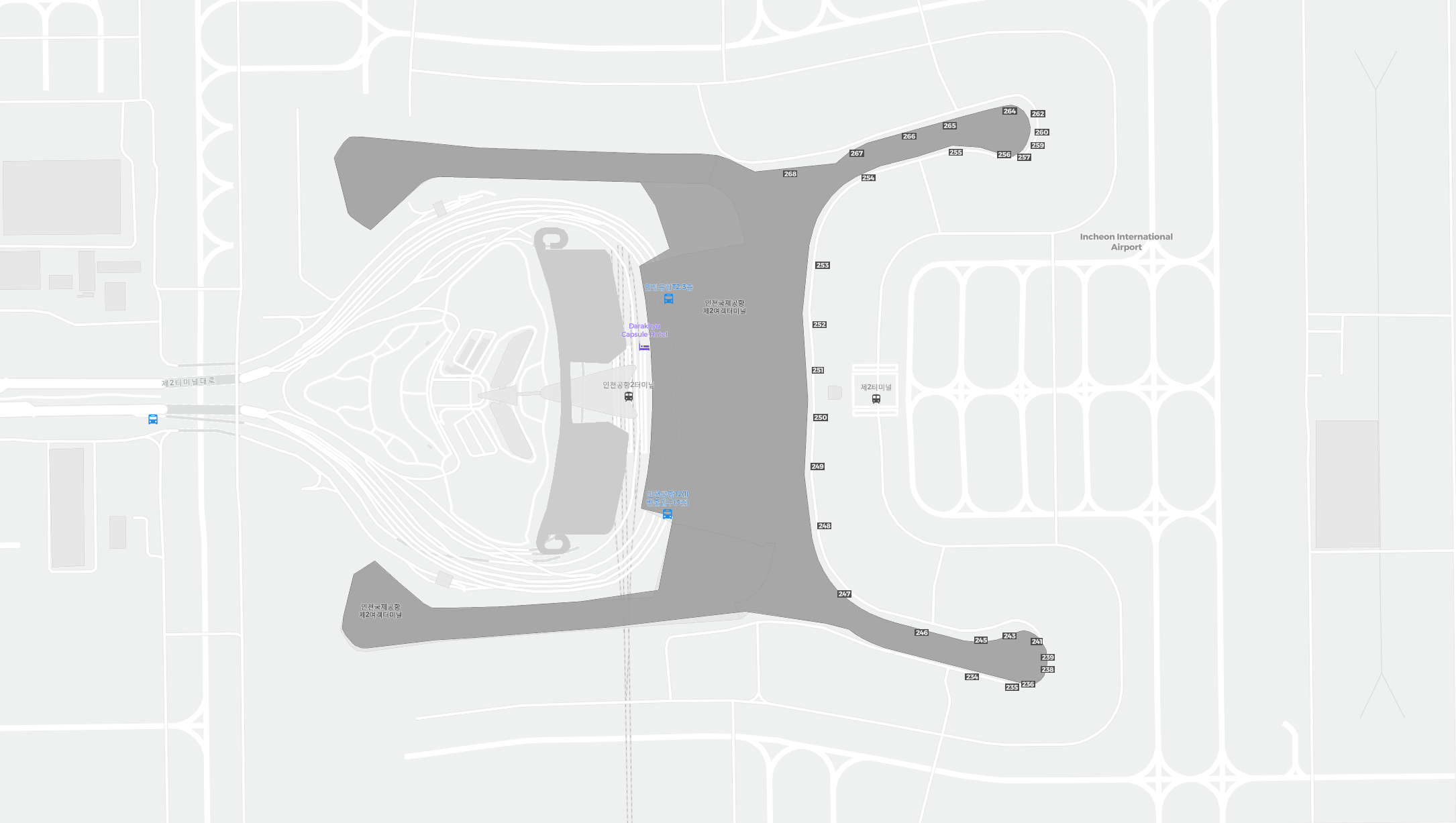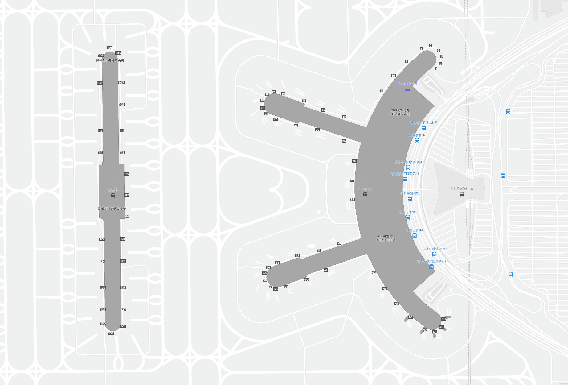 This is a zoomable map over Incheon (ICN). The map can give you an overview of the outdoor area with terminals, parkings, and at some airports also details of gates, car rental facilities, and other amenities if you zoom in.