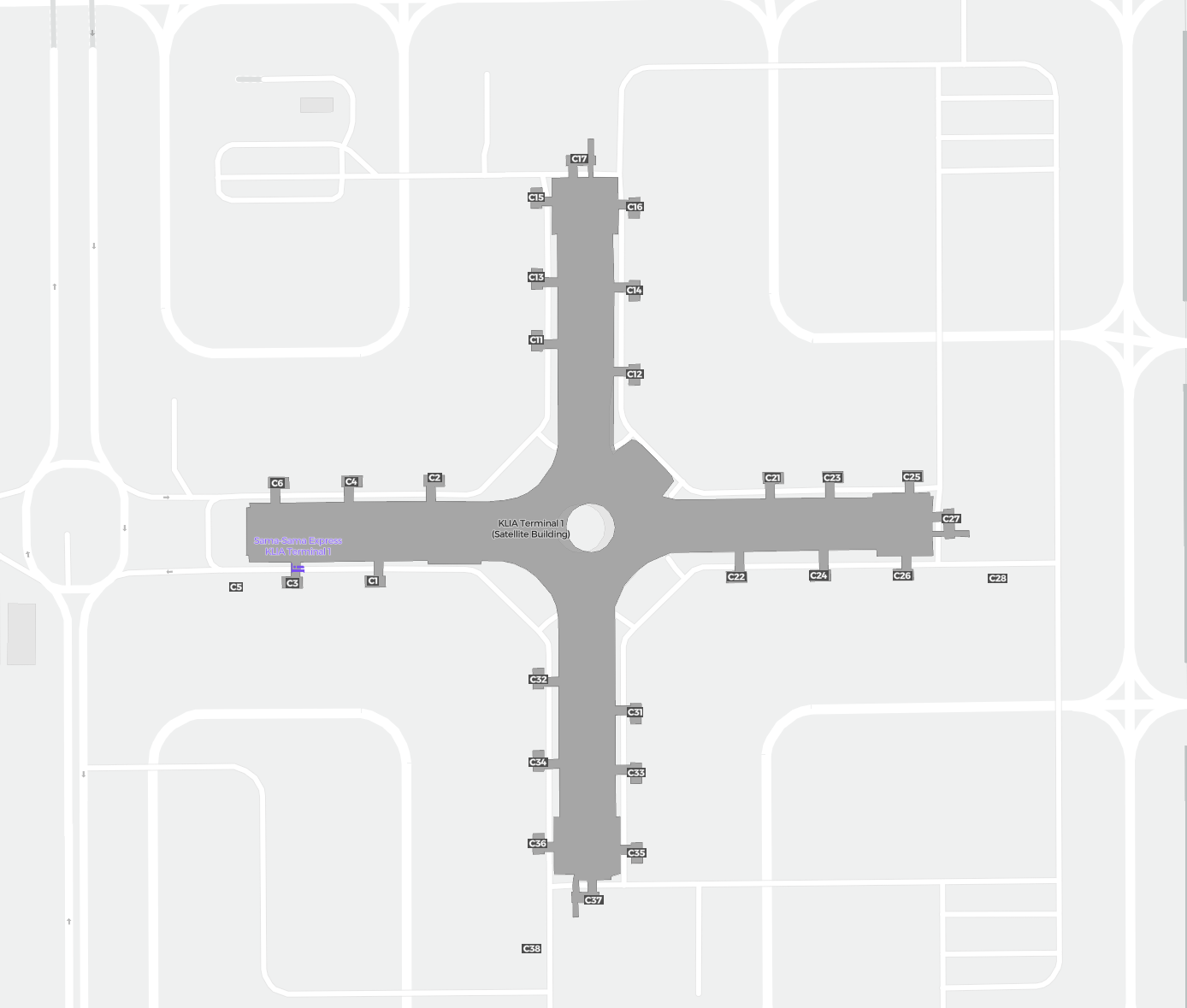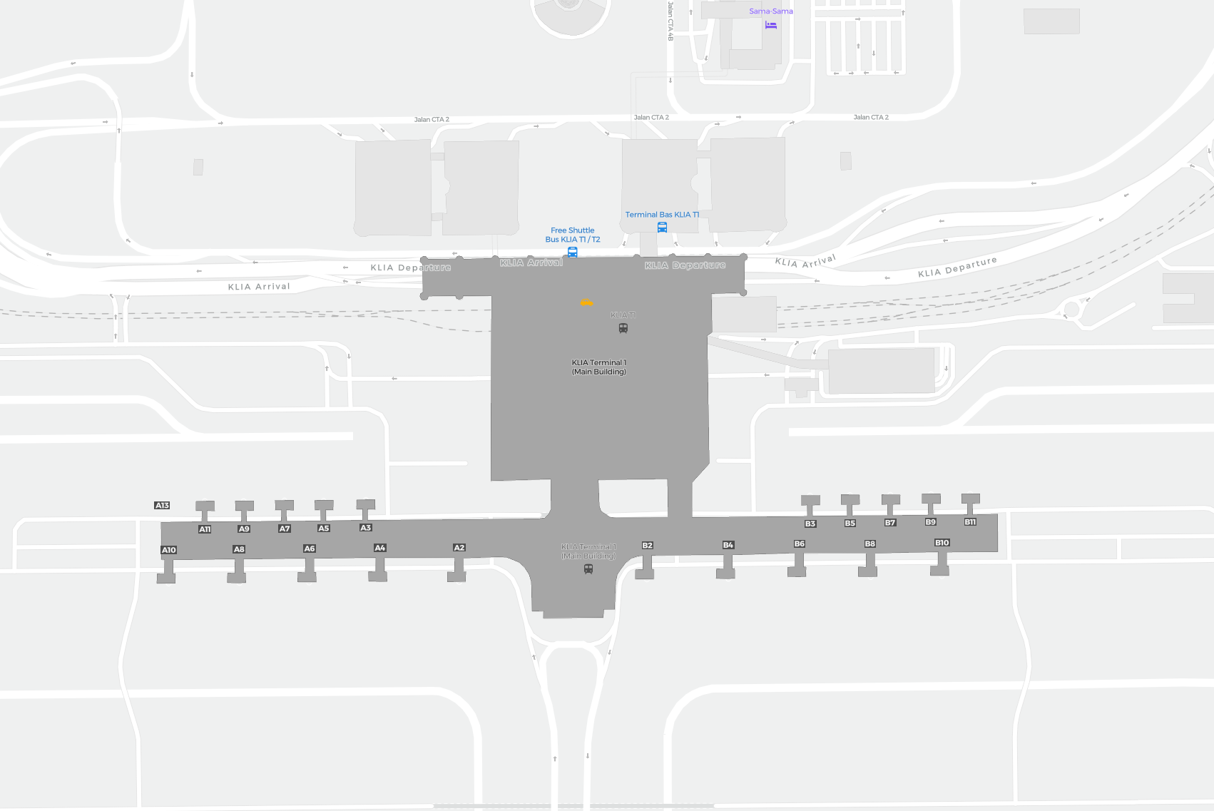 This is a zoomable map over Kuala Lumpur (KUL). The map can give you an overview of the outdoor area with terminals, parkings, and at some airports also details of gates, car rental facilities, and other amenities if you zoom in.