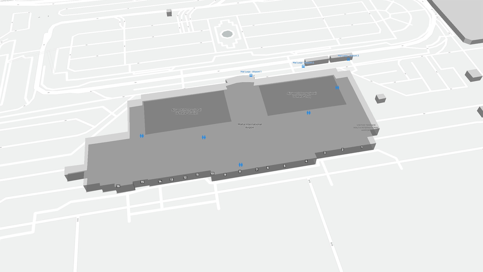 This is a zoomable map over Luqa (MLA). The map can give you an overview of the outdoor area with terminals, parkings, and at some airports also details of gates, car rental facilities, and other amenities if you zoom in.