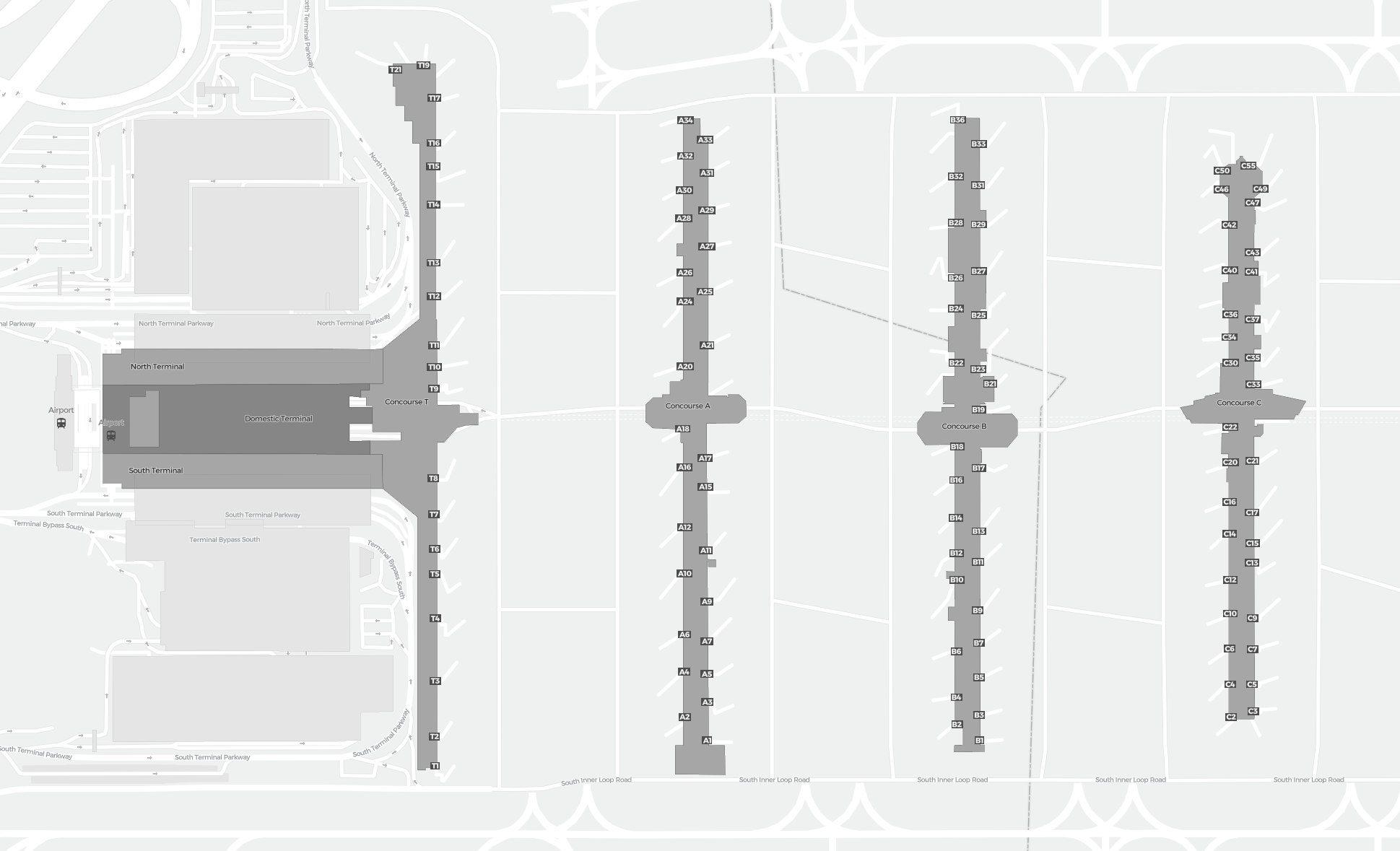 This is a zoomable map over Atlanta (ATL). The map can give you an overview of the outdoor area with terminals, parkings, and at some airports also details of gates, car rental facilities, and other amenities if you zoom in.