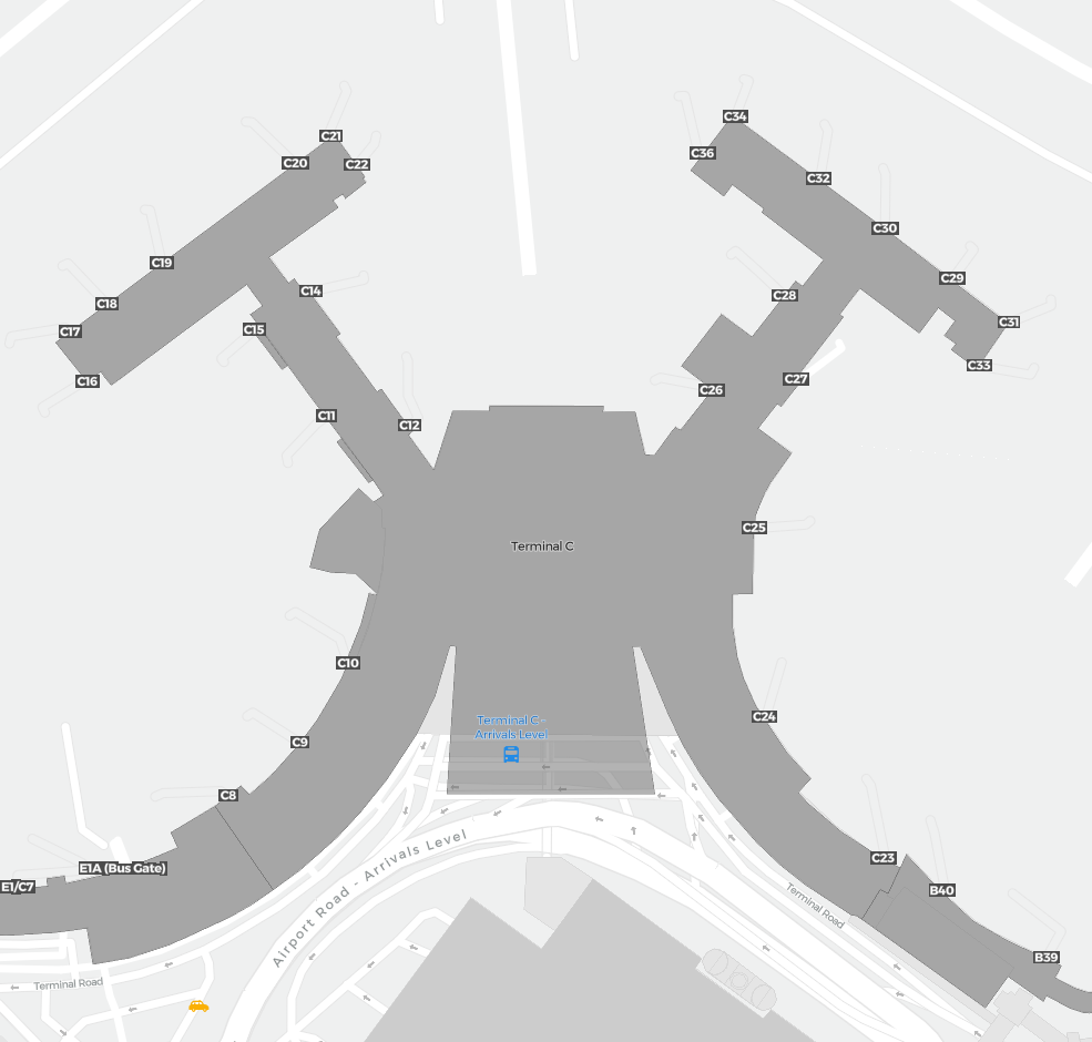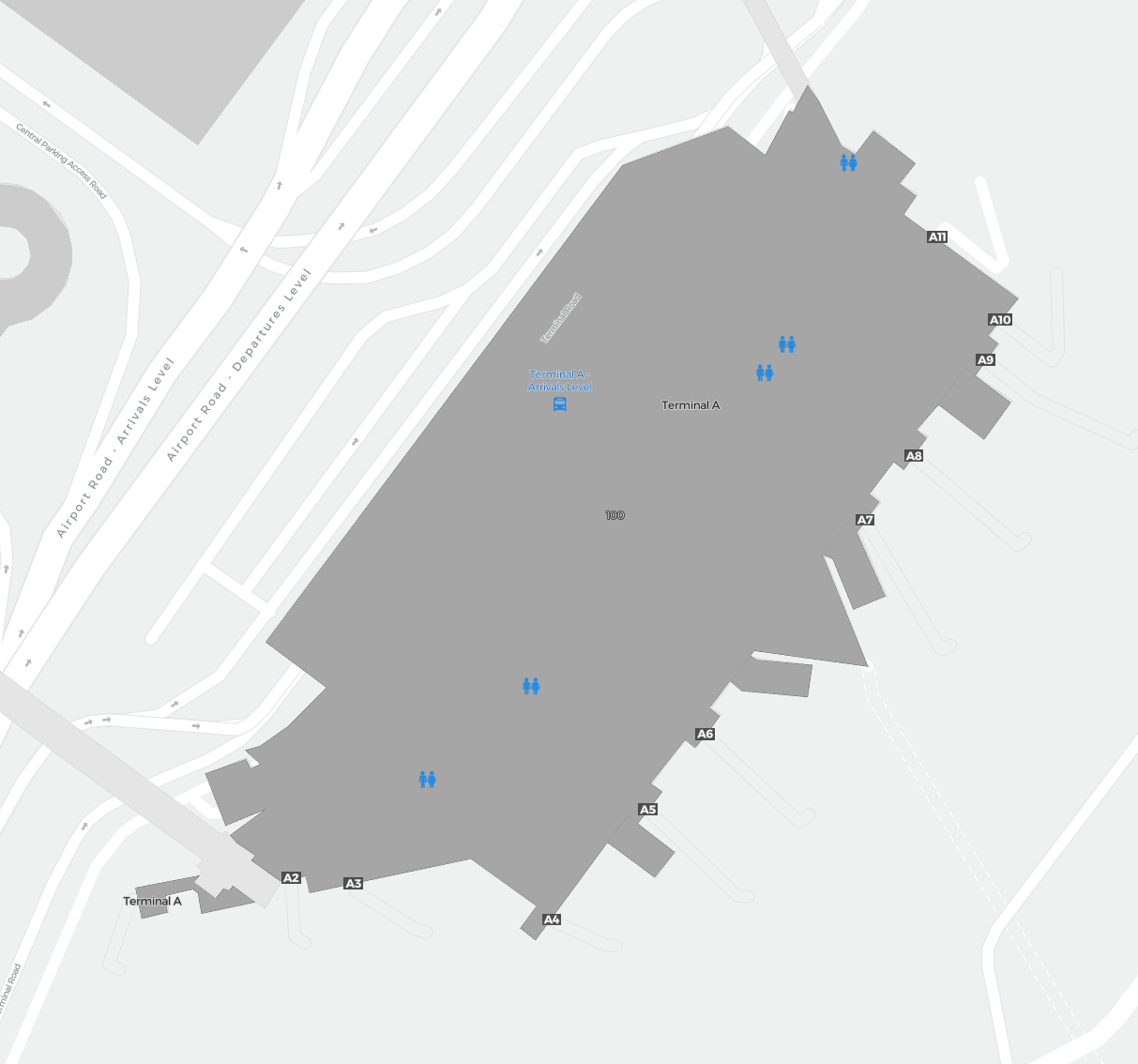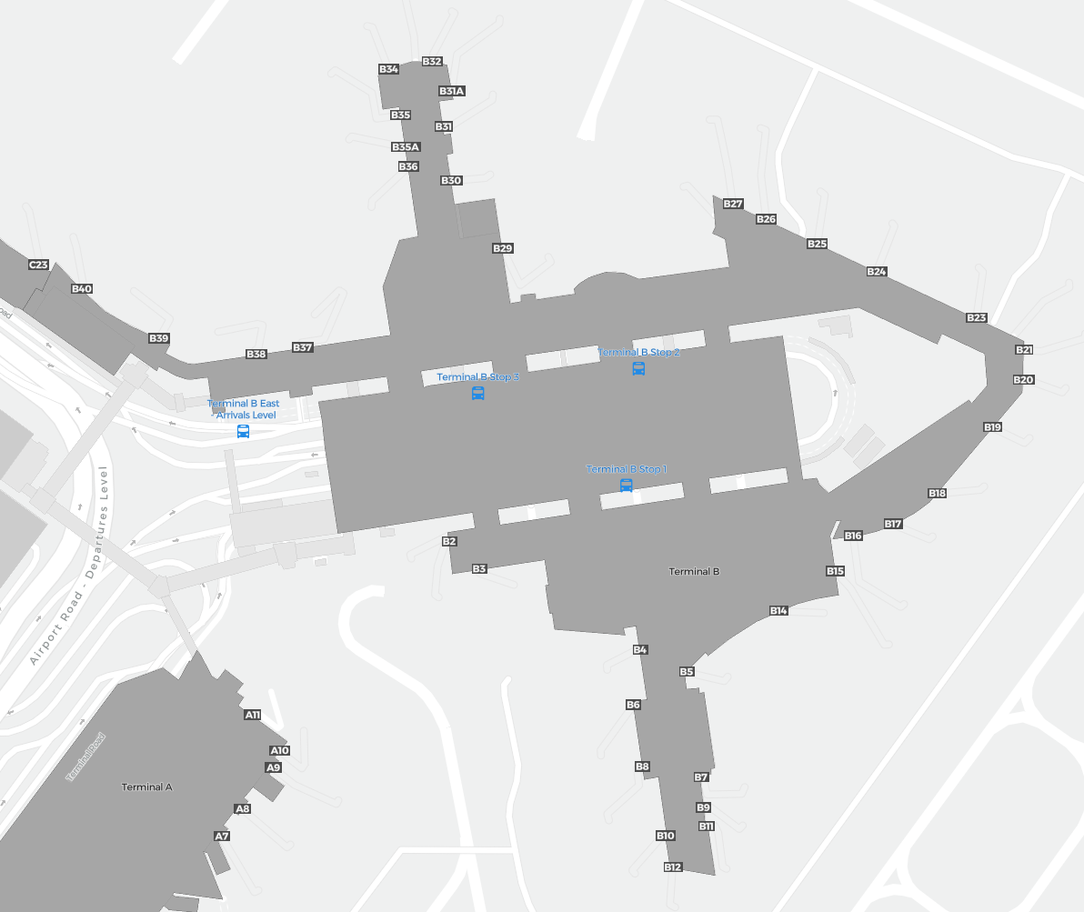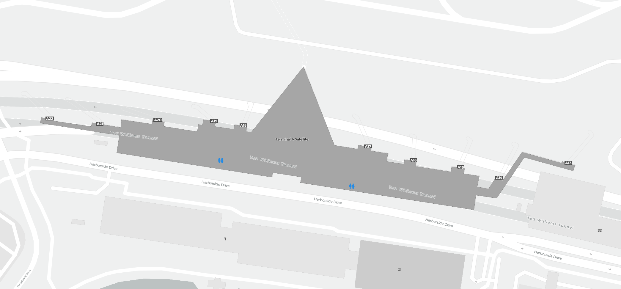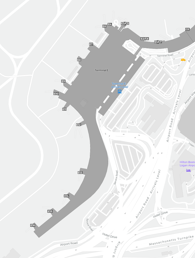 This is a zoomable map over Boston (BOS). The map can give you an overview of the outdoor area with terminals, parkings, and at some airports also details of gates, car rental facilities, and other amenities if you zoom in.
