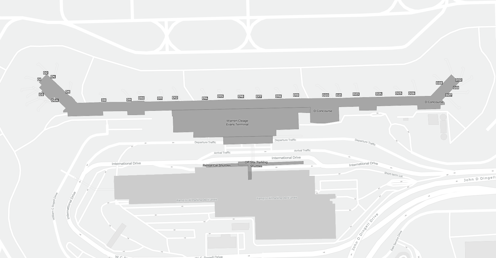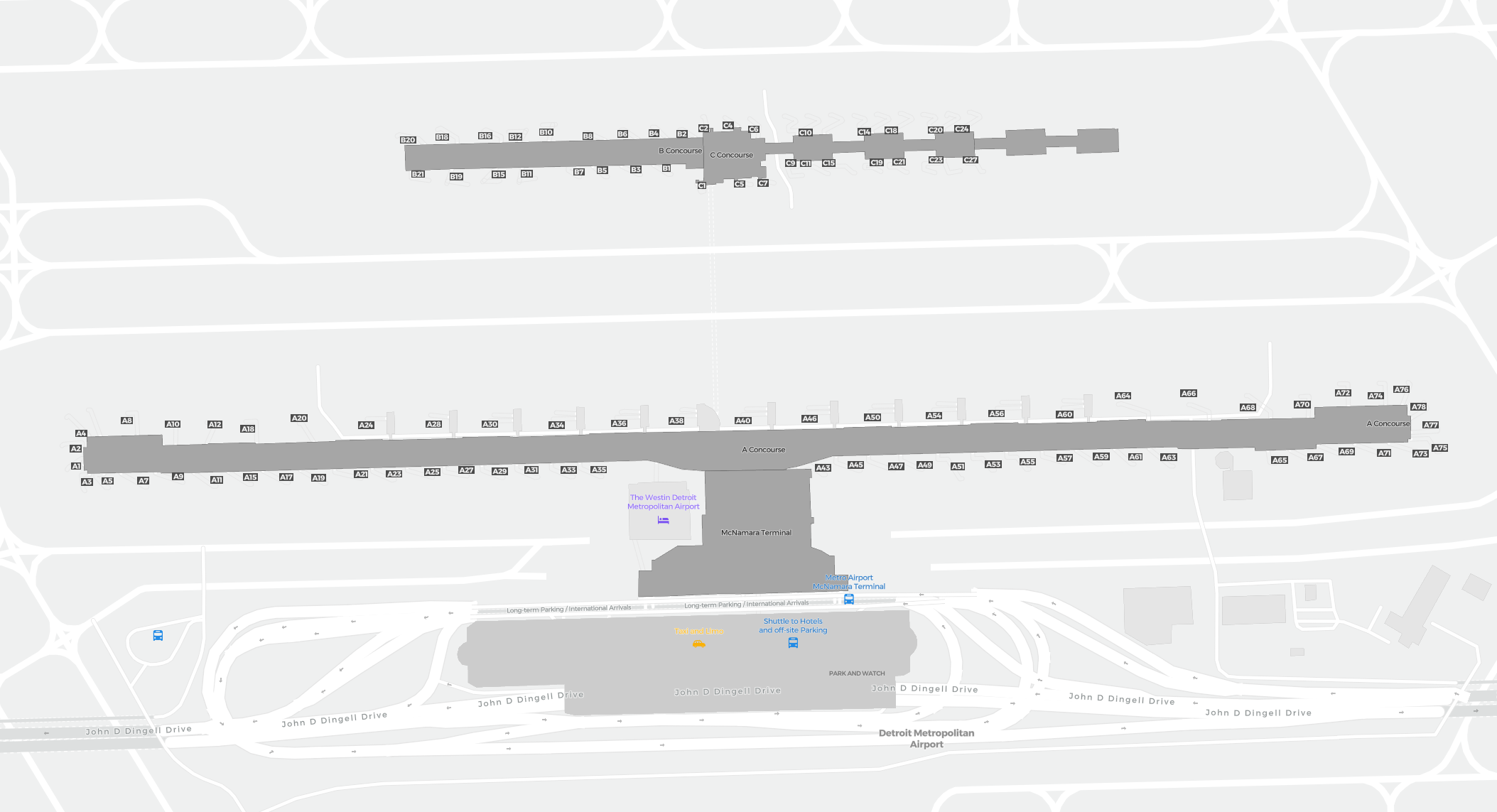 This is a zoomable map over Detroit (DTW). The map can give you an overview of the outdoor area with terminals, parkings, and at some airports also details of gates, car rental facilities, and other amenities if you zoom in.