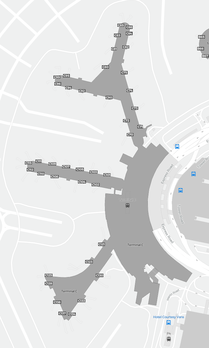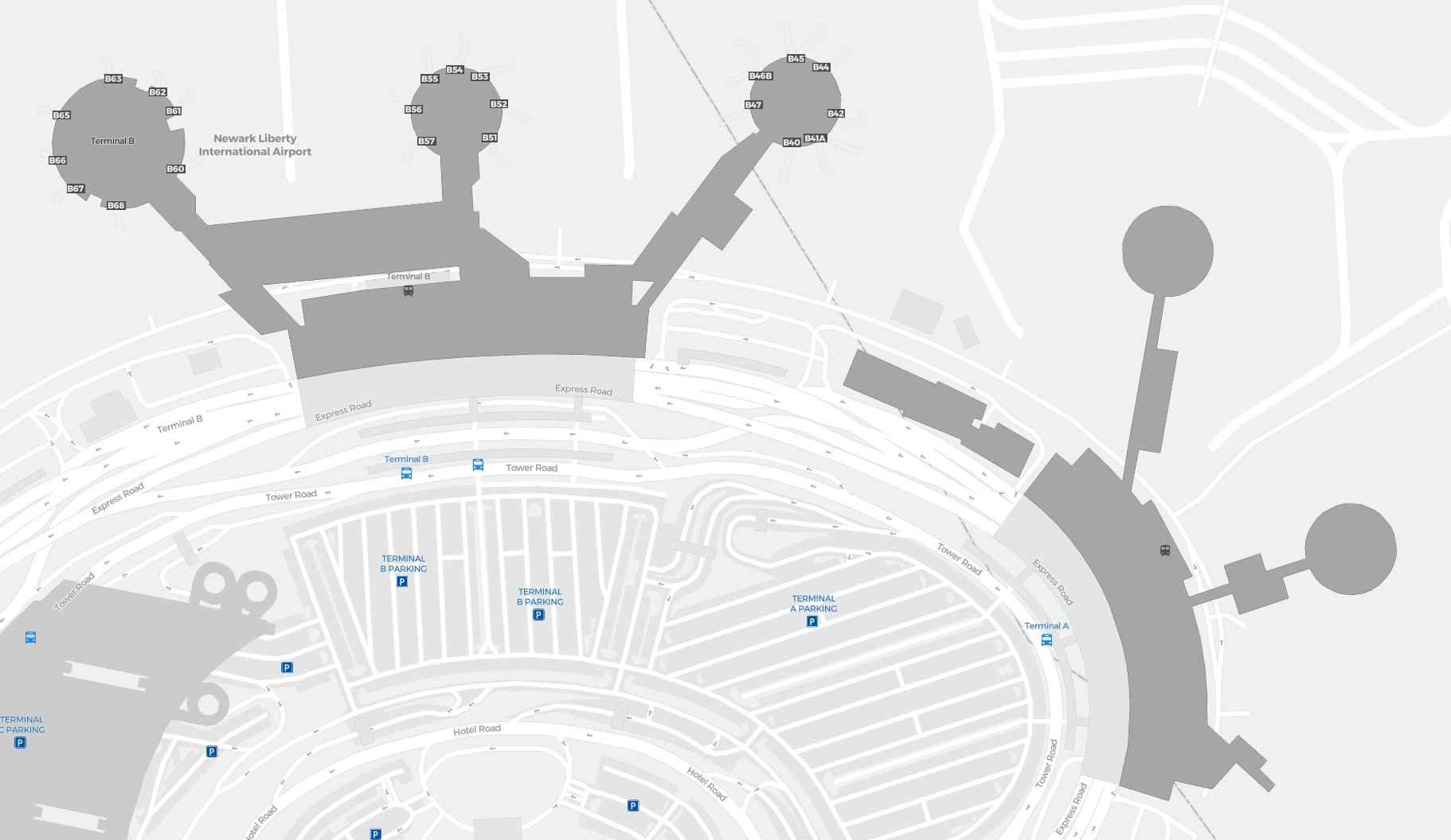 This is a zoomable map over Newark (EWR). The map can give you an overview of the outdoor area with terminals, parkings, and at some airports also details of gates, car rental facilities, and other amenities if you zoom in.