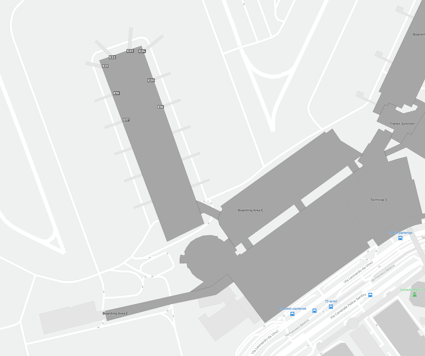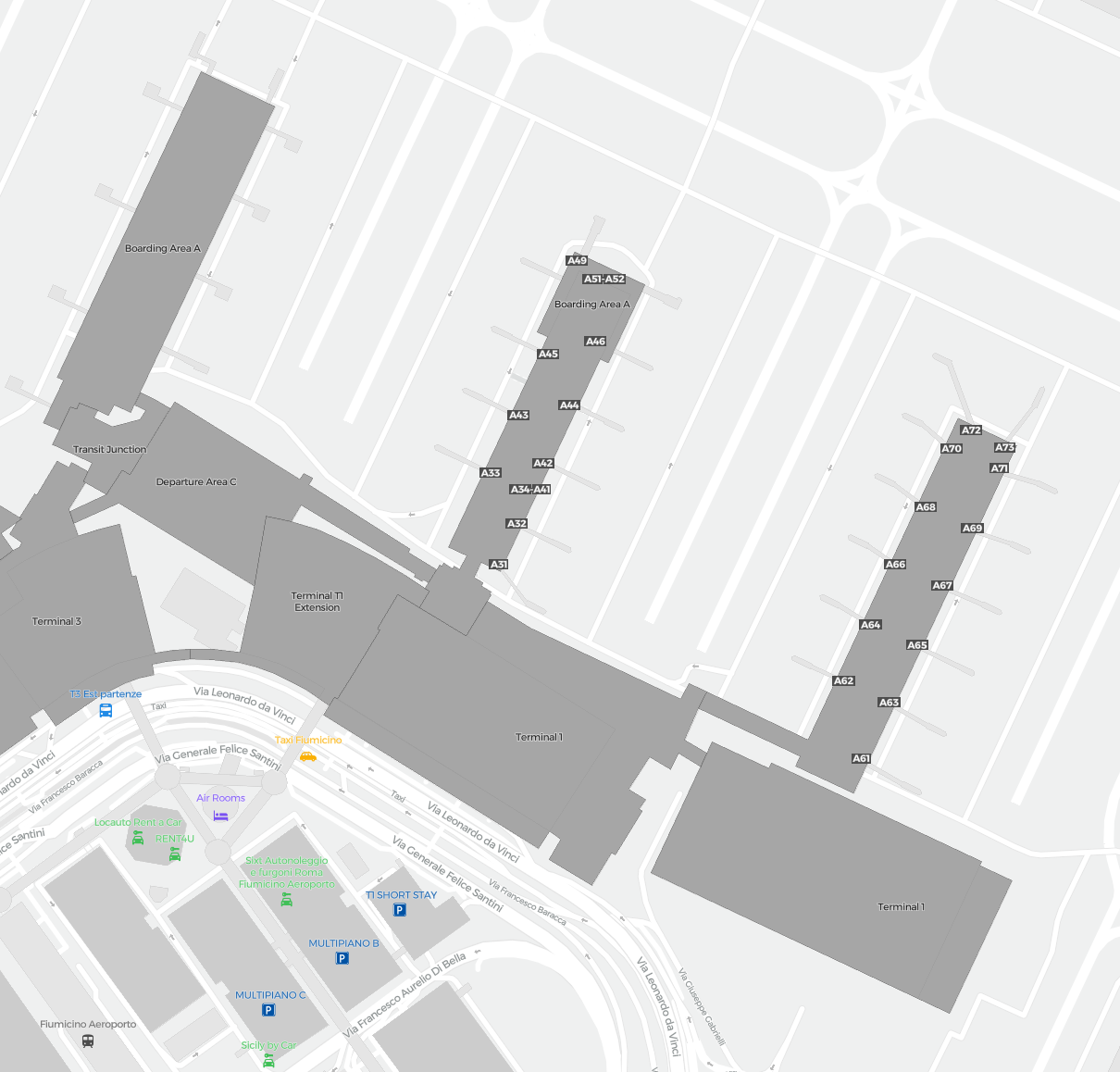 This is a zoomable map over Rome (FCO). The map can give you an overview of the outdoor area with terminals, parkings, and at some airports also details of gates, car rental facilities, and other amenities if you zoom in.