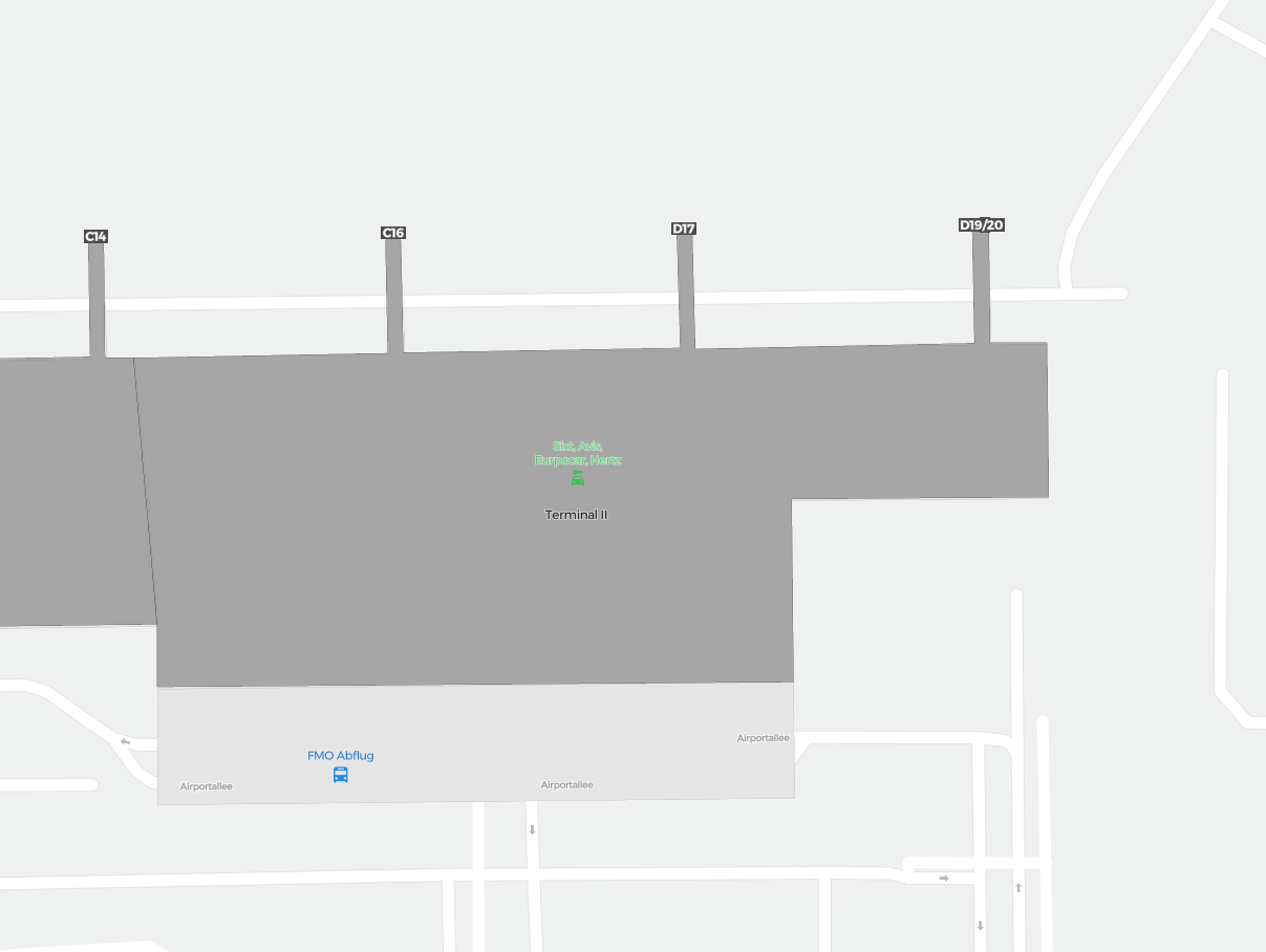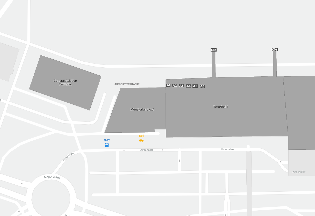 This is a zoomable map over Münster (FMO). The map can give you an overview of the outdoor area with terminals, parkings, and at some airports also details of gates, car rental facilities, and other amenities if you zoom in.