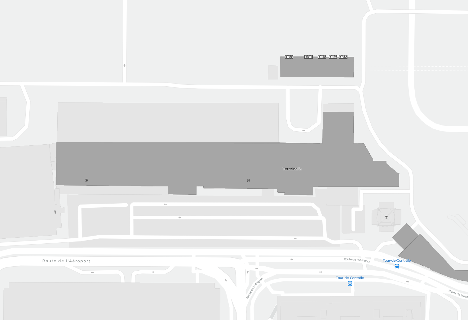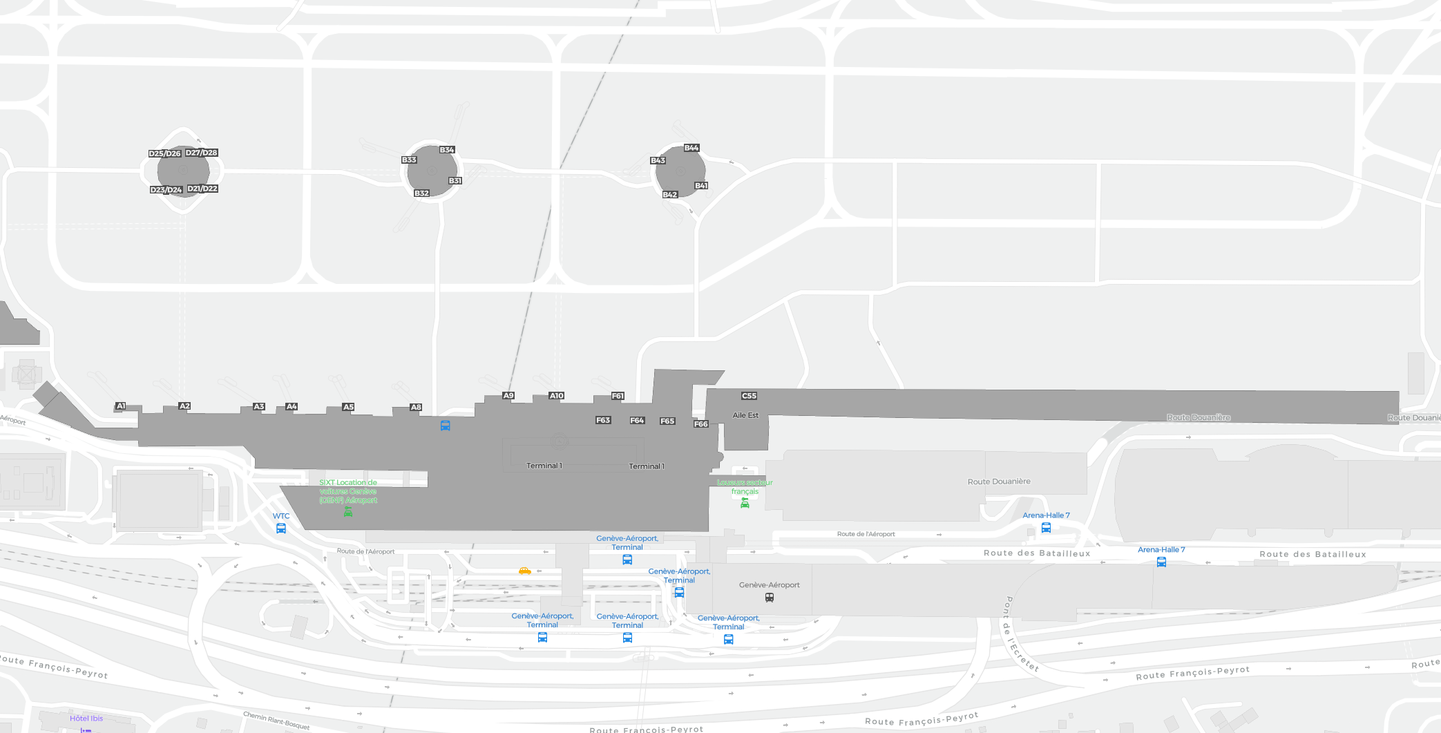This is a zoomable map over Geneva (GVA). The map can give you an overview of the outdoor area with terminals, parkings, and at some airports also details of gates, car rental facilities, and other amenities if you zoom in.
