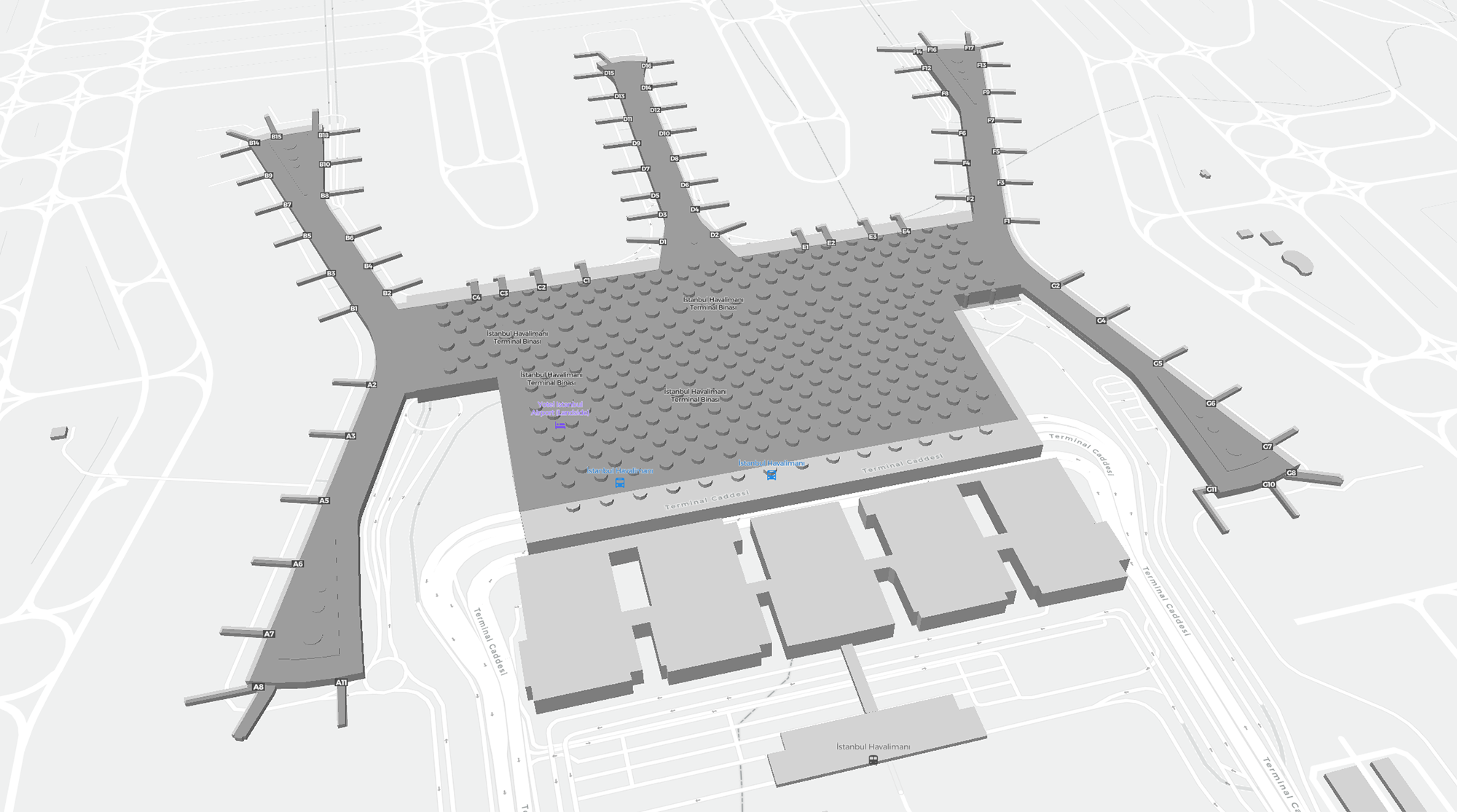 This is a zoomable map over Istanbul (IST). The map can give you an overview of the outdoor area with terminals, parkings, and at some airports also details of gates, car rental facilities, and other amenities if you zoom in.
