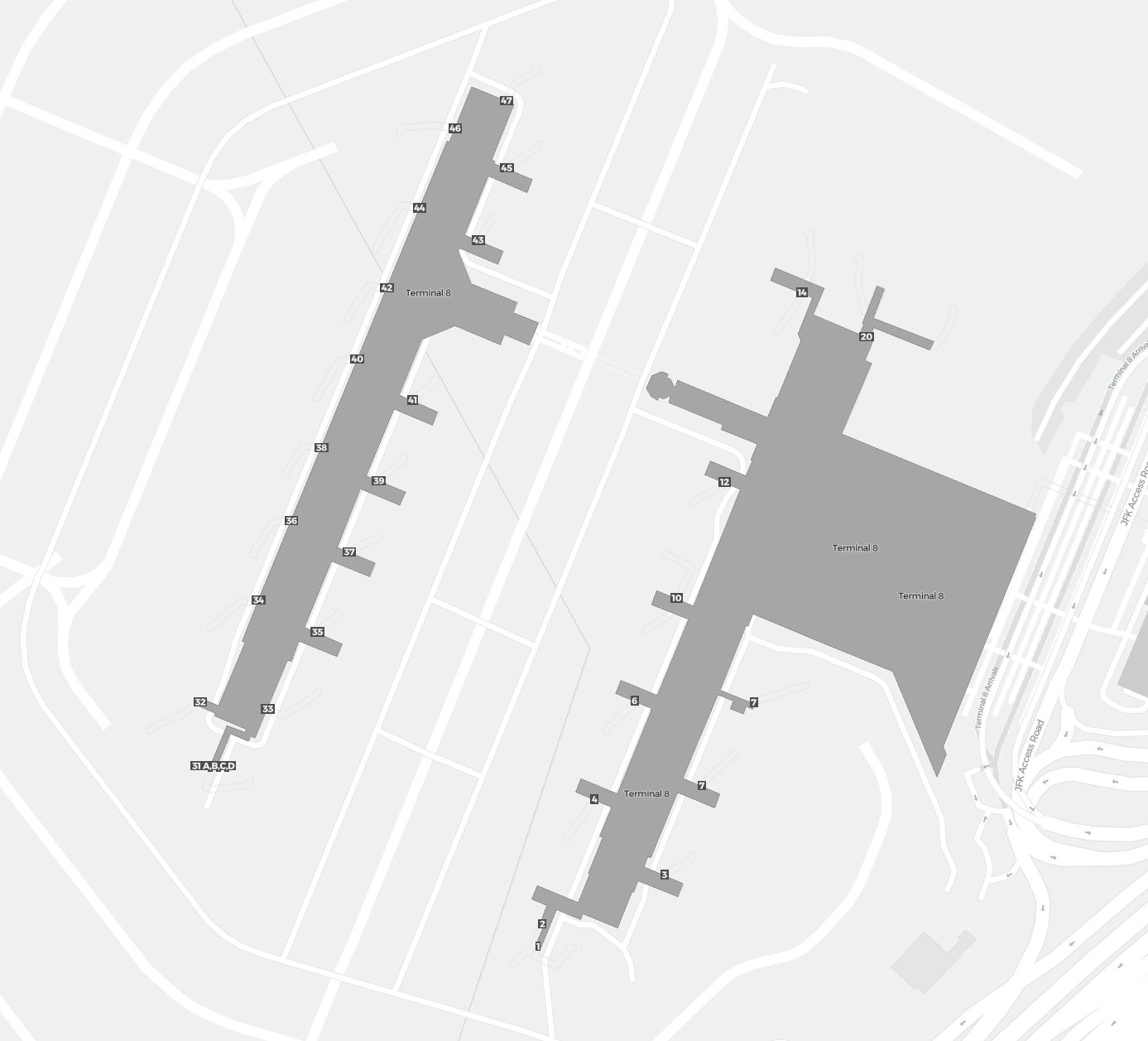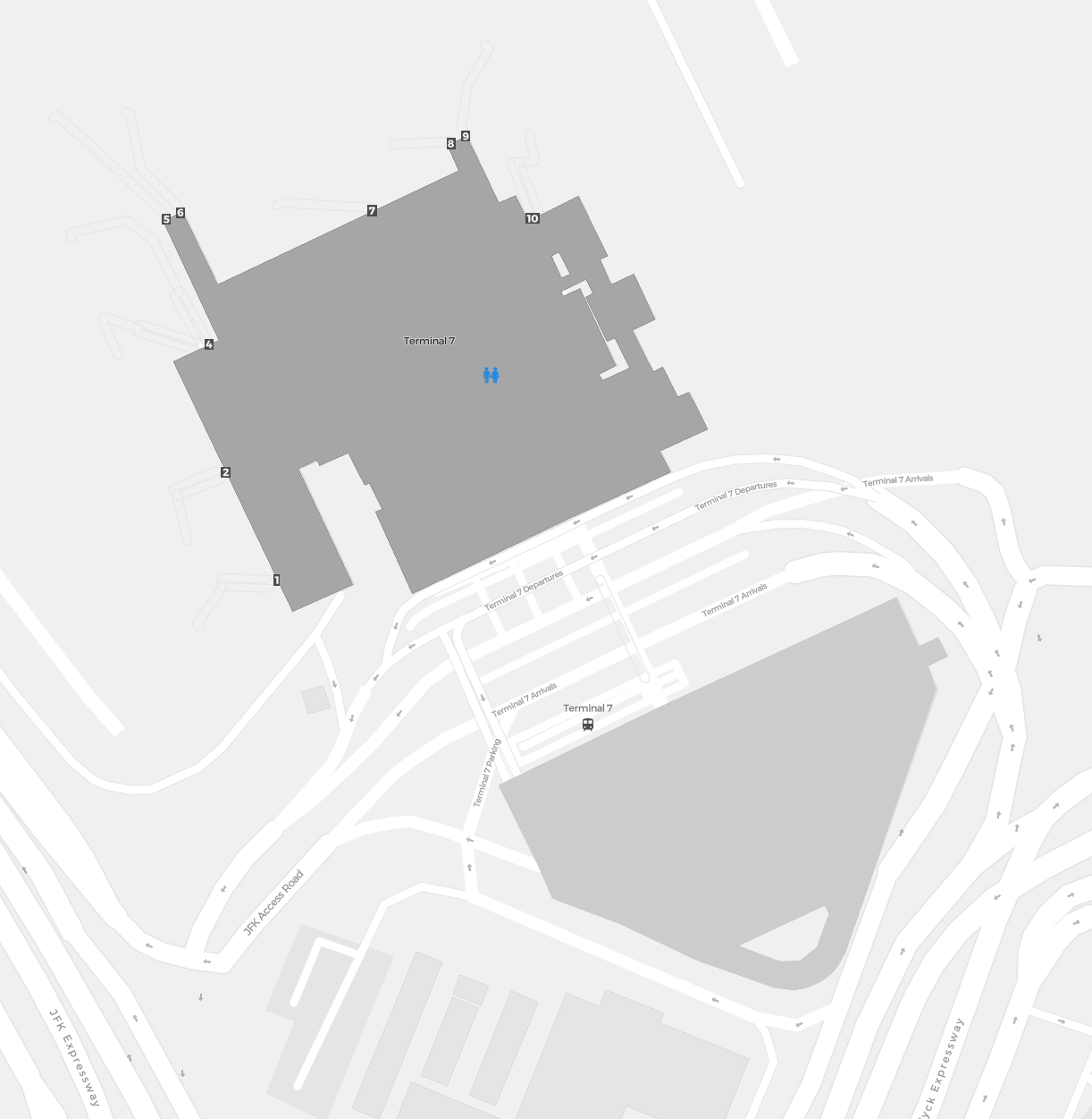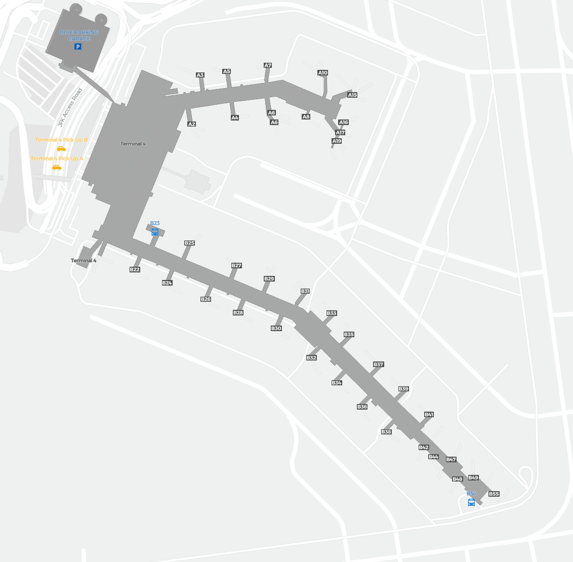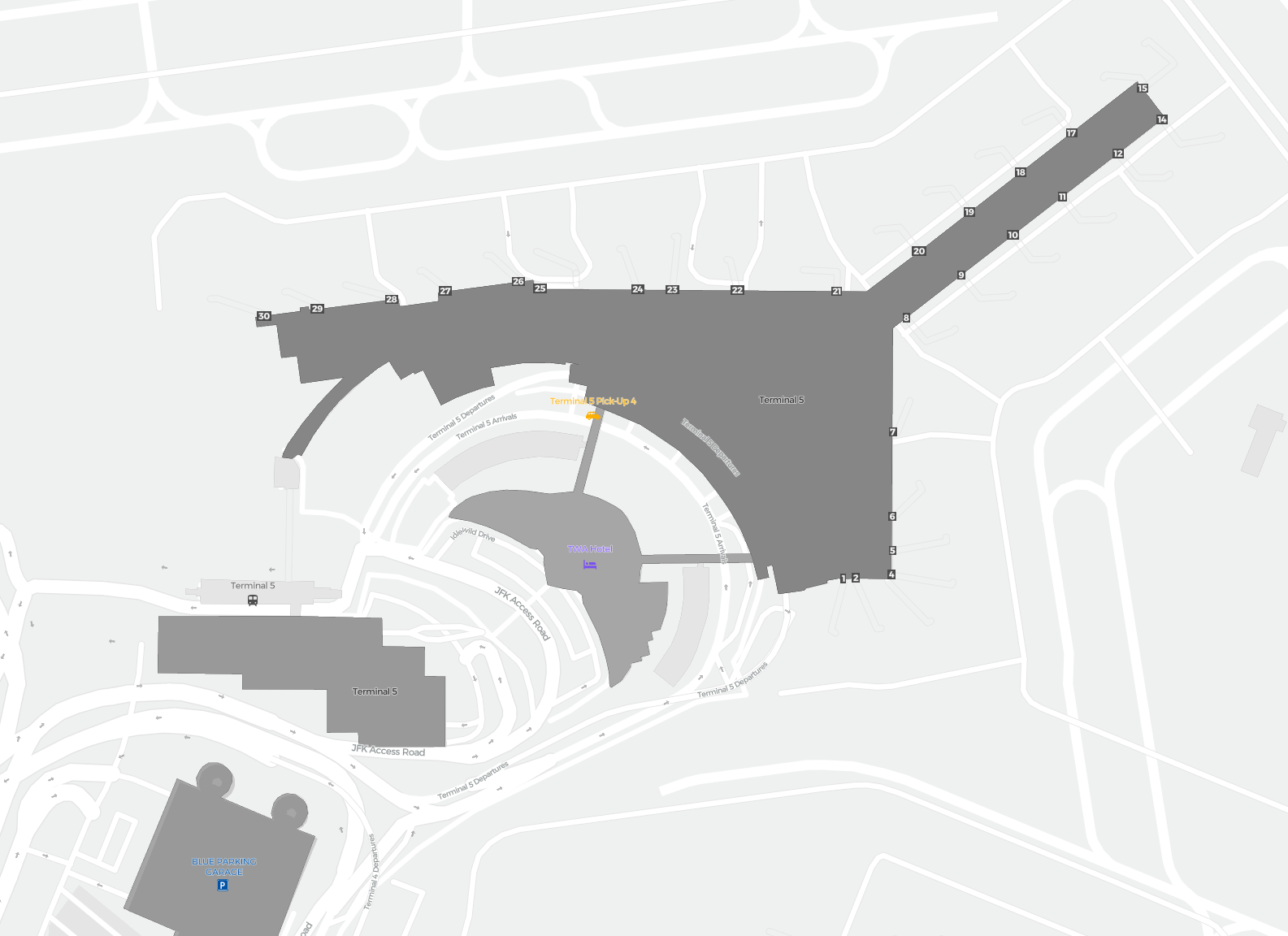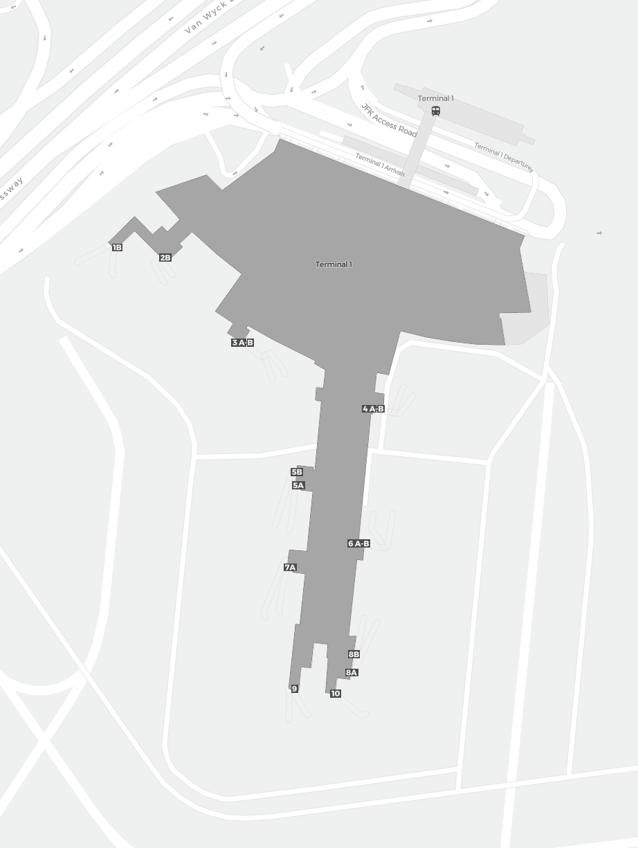 This is a zoomable map over New York (JFK). The map can give you an overview of the outdoor area with terminals, parkings, and at some airports also details of gates, car rental facilities, and other amenities if you zoom in.