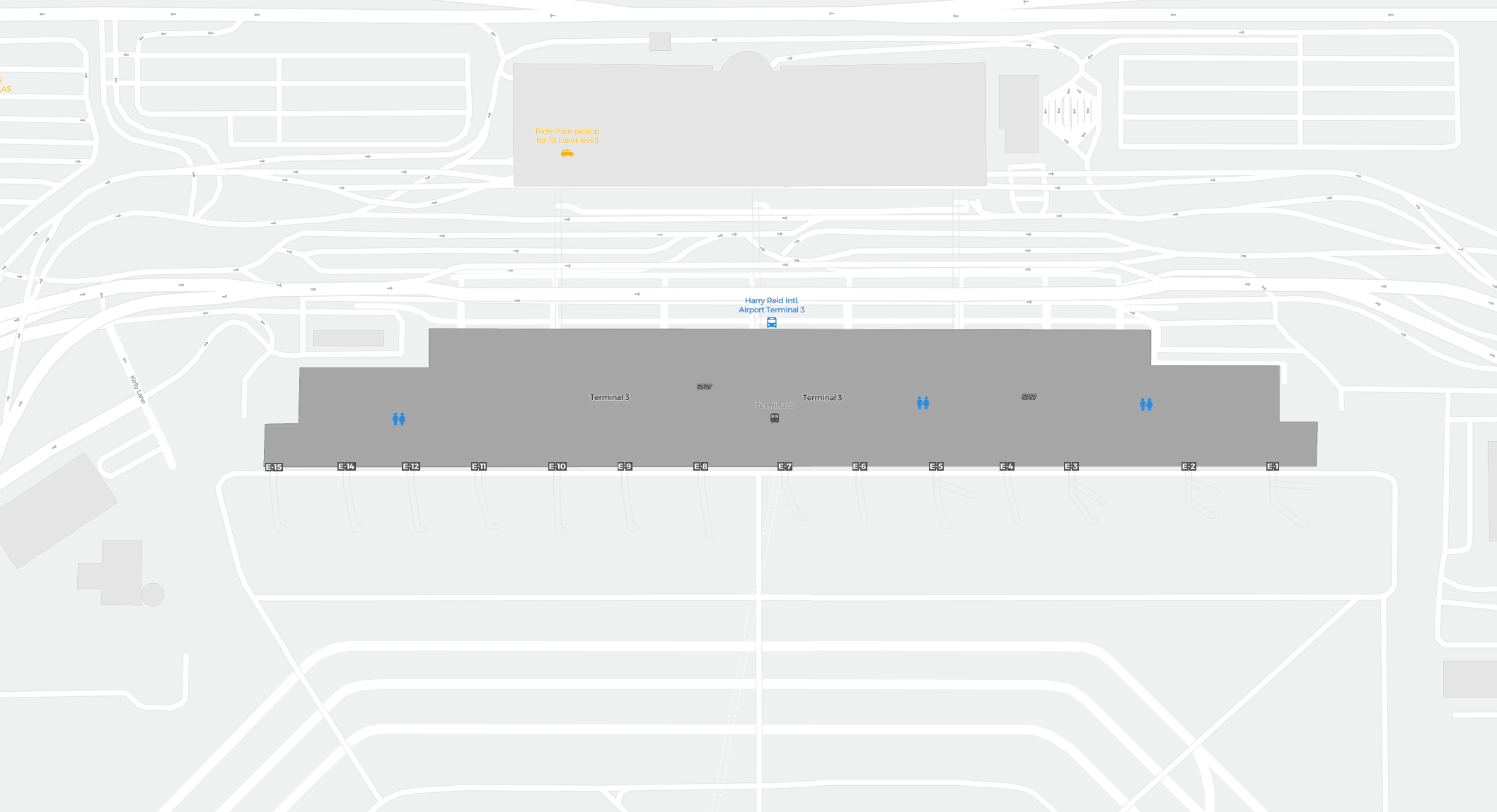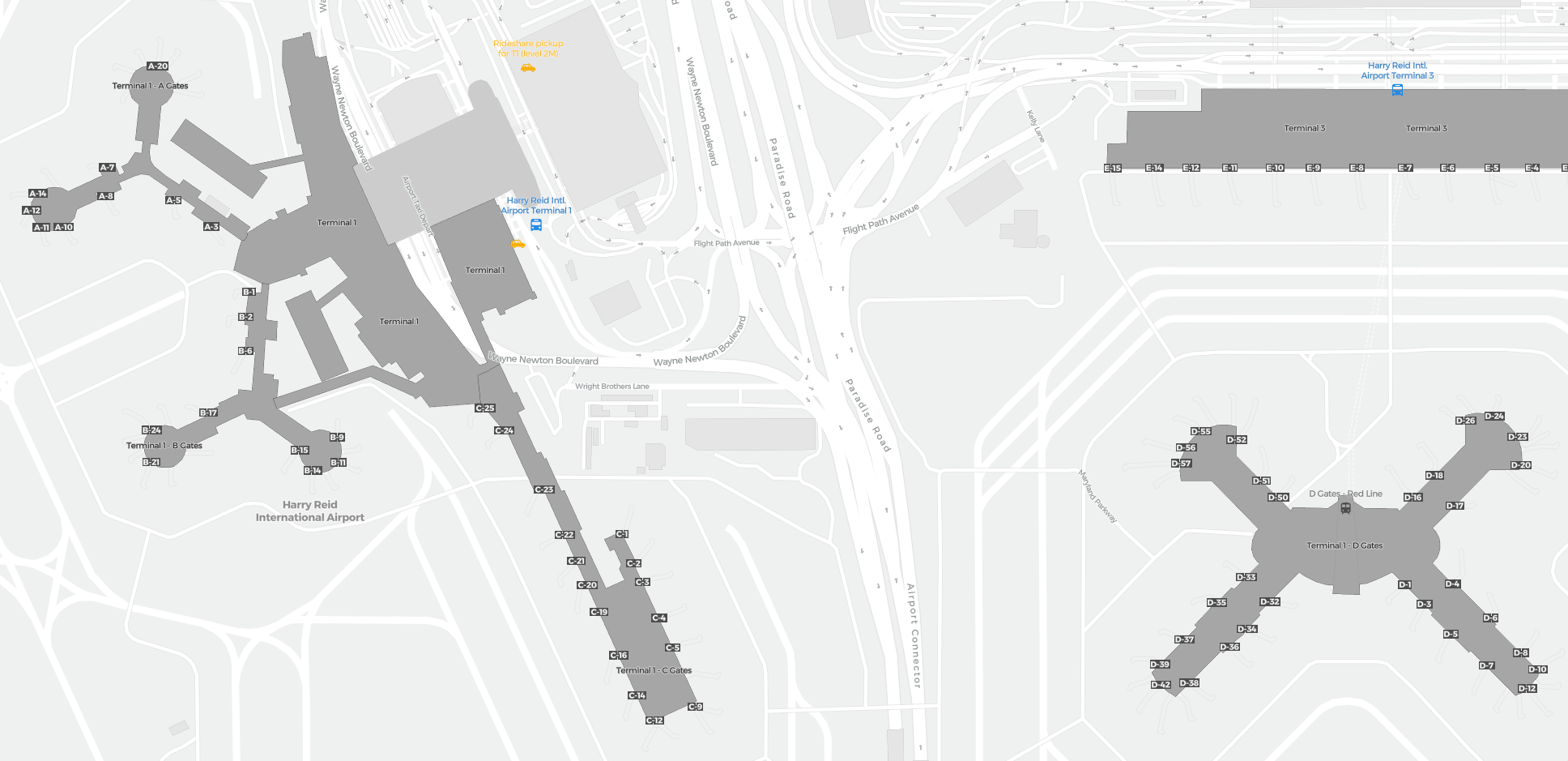 This is a zoomable map over Las Vegas (LAS). The map can give you an overview of the outdoor area with terminals, parkings, and at some airports also details of gates, car rental facilities, and other amenities if you zoom in.