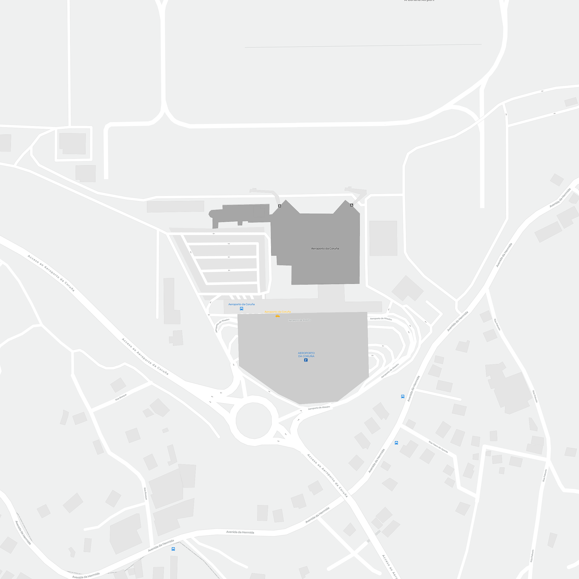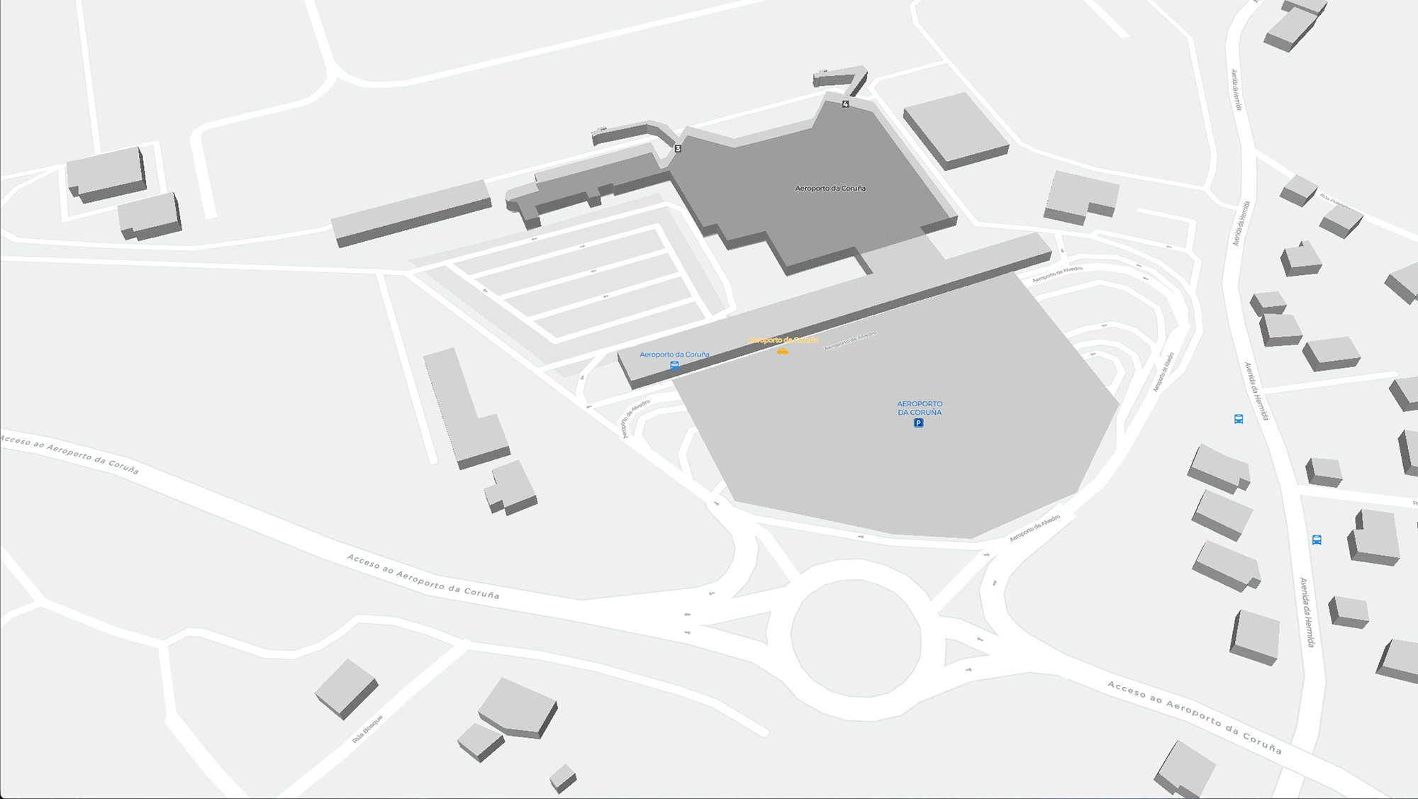 This is a zoomable map over A Coruña (LCG). The map can give you an overview of the outdoor area with terminals, parkings, and at some airports also details of gates, car rental facilities, and other amenities if you zoom in.