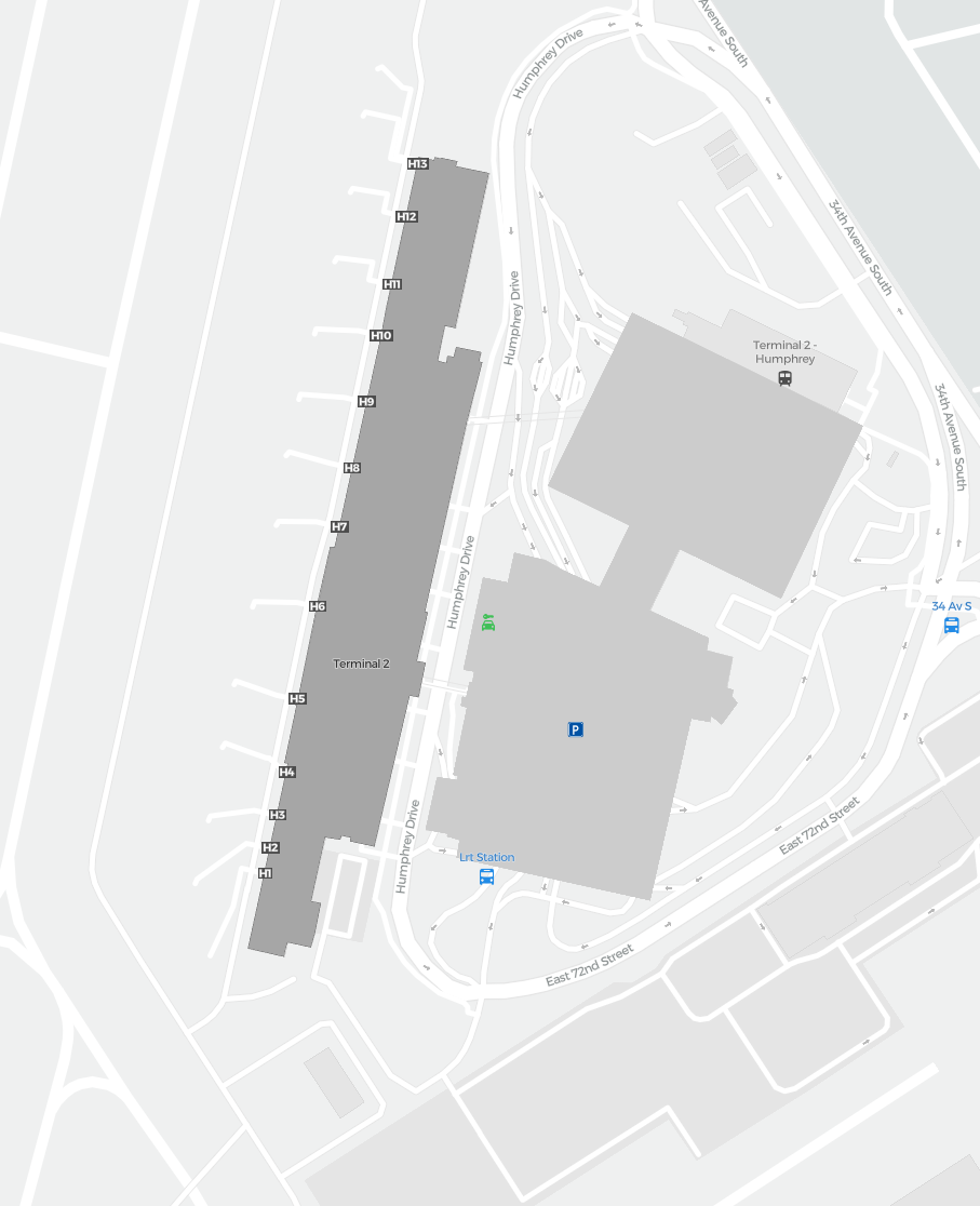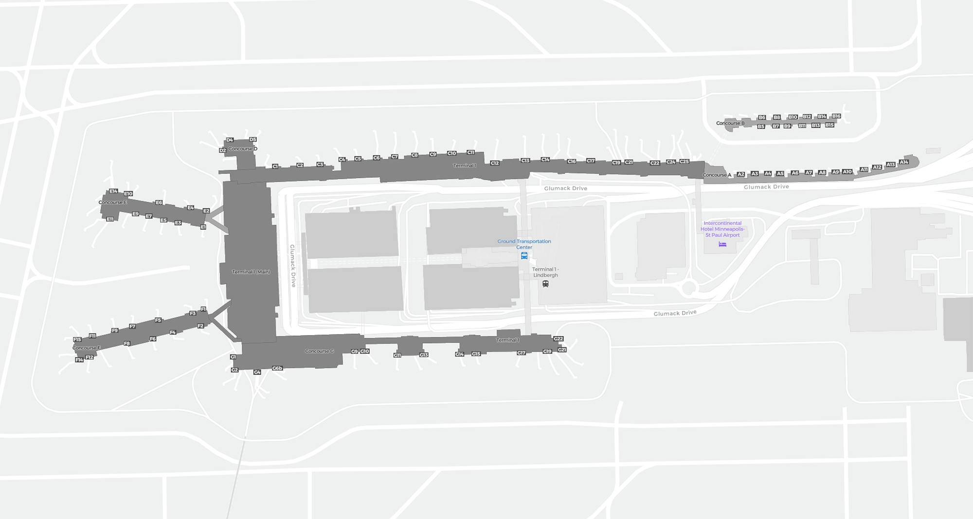 This is a zoomable map over Minneapolis (MSP). The map can give you an overview of the outdoor area with terminals, parkings, and at some airports also details of gates, car rental facilities, and other amenities if you zoom in.