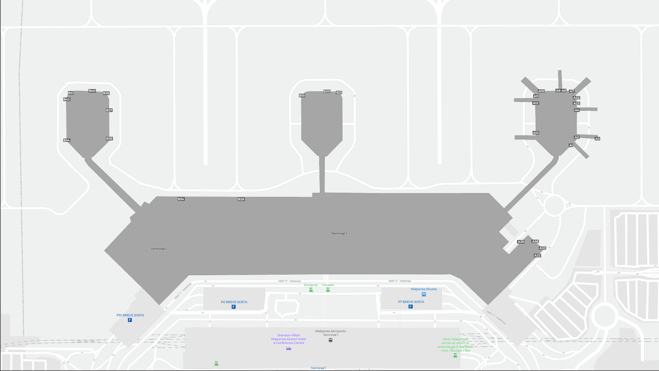This is a zoomable map over Milan (MXP). The map can give you an overview of the outdoor area with terminals, parkings, and at some airports also details of gates, car rental facilities, and other amenities if you zoom in.