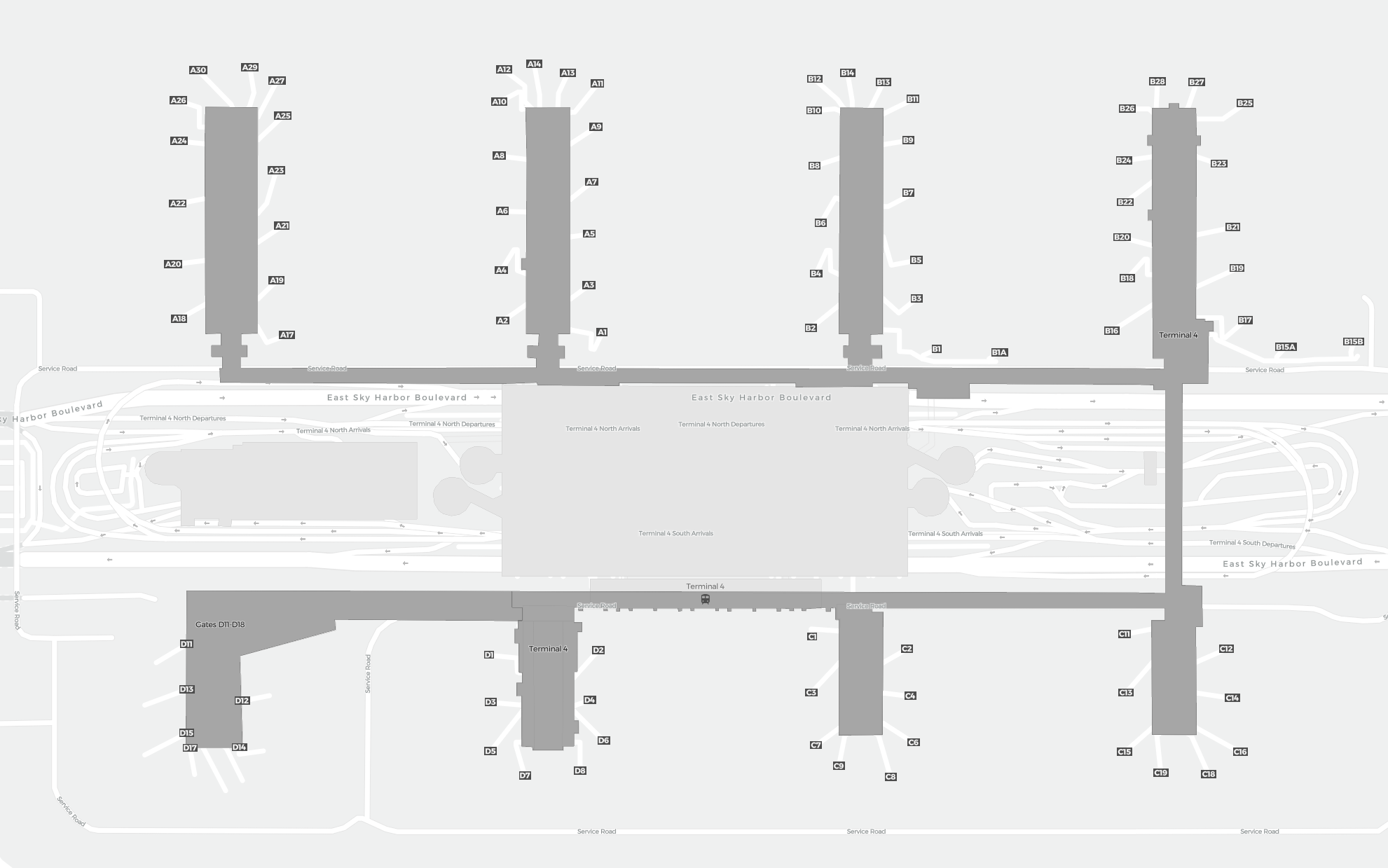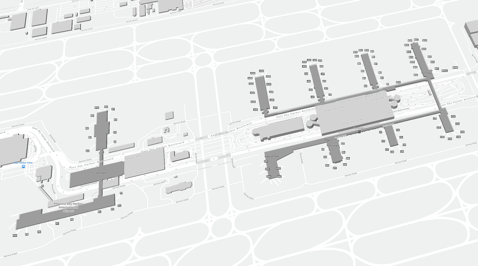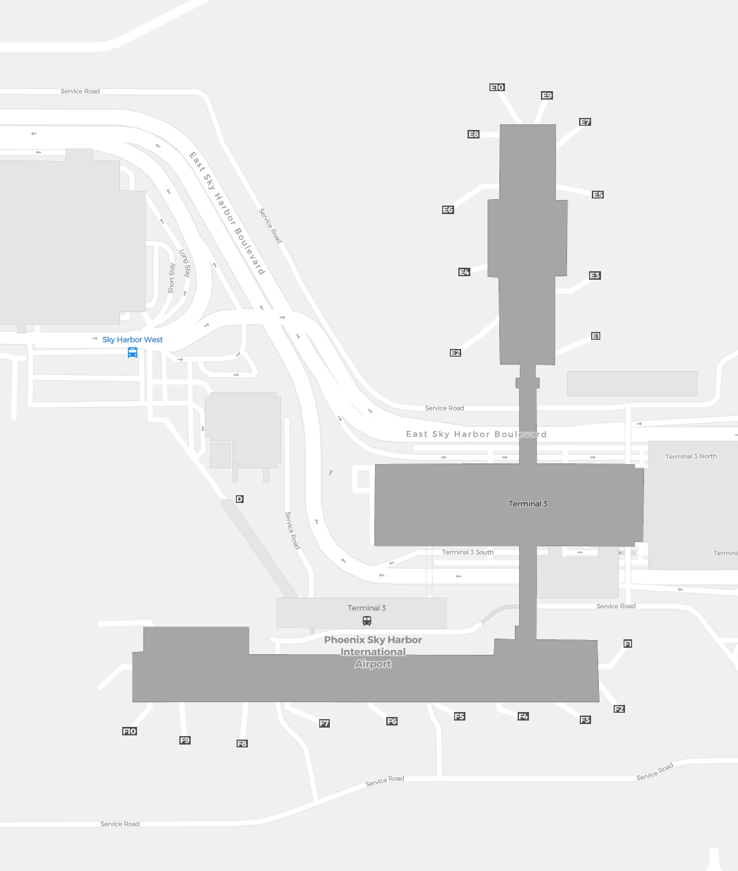 This is a zoomable map over Phoenix (PHX). The map can give you an overview of the outdoor area with terminals, parkings, and at some airports also details of gates, car rental facilities, and other amenities if you zoom in.