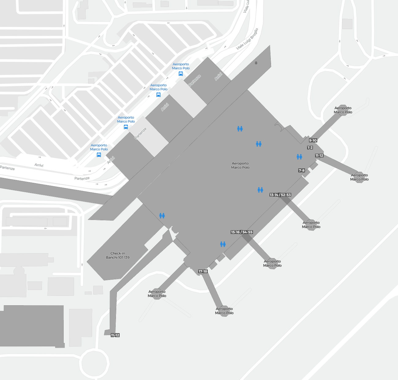 This is a zoomable map over Venice (VCE). The map can give you an overview of the outdoor area with terminals, parkings, and at some airports also details of gates, car rental facilities, and other amenities if you zoom in.