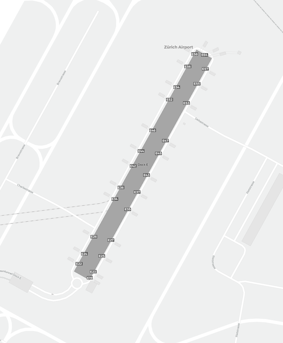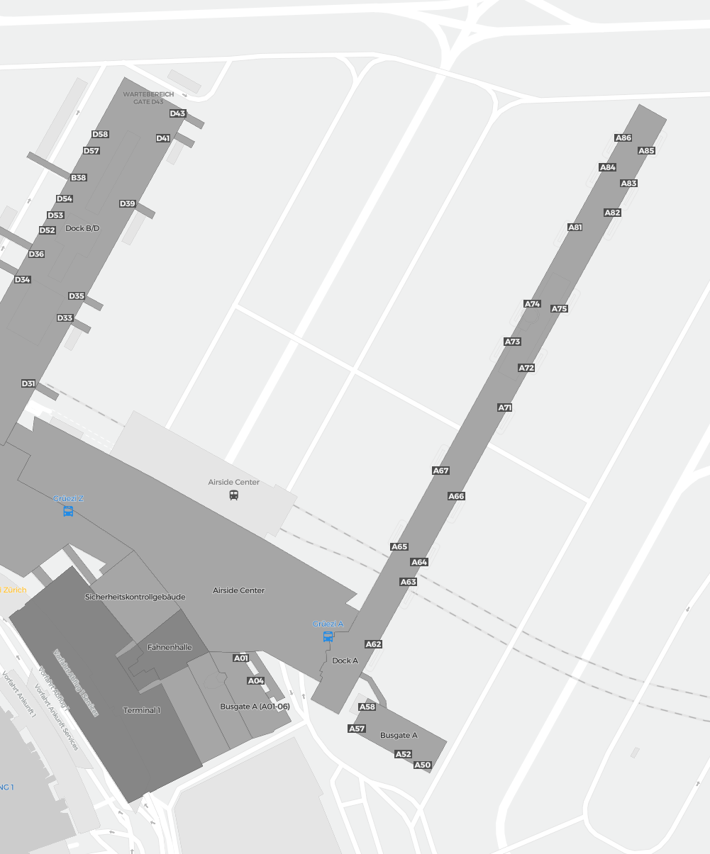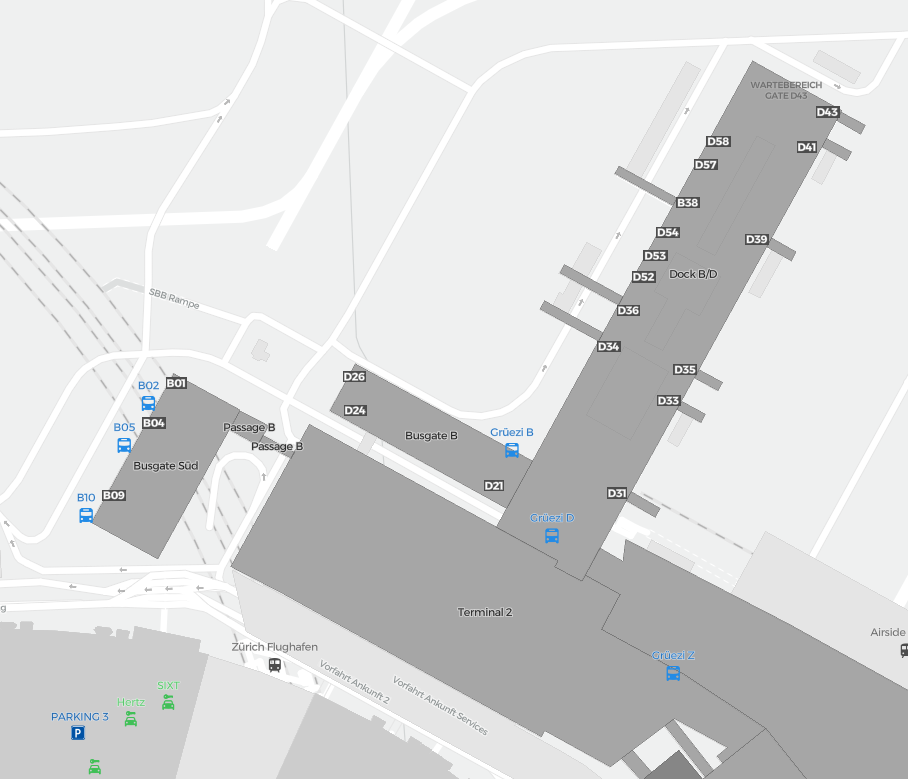This is a zoomable map over Zurich (ZRH). The map can give you an overview of the outdoor area with terminals, parkings, and at some airports also details of gates, car rental facilities, and other amenities if you zoom in.